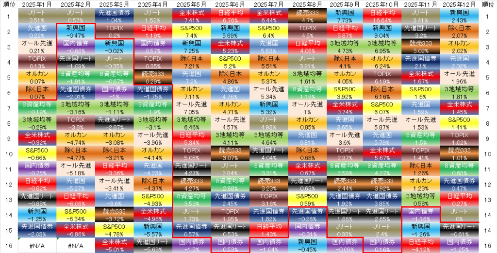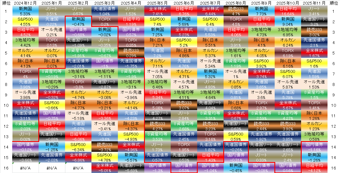 新興国は月次で見ると上位になったり下位になったりと振れ幅が結構大きいですが、全体を通してみれば最近はなかなか好成績のようです。