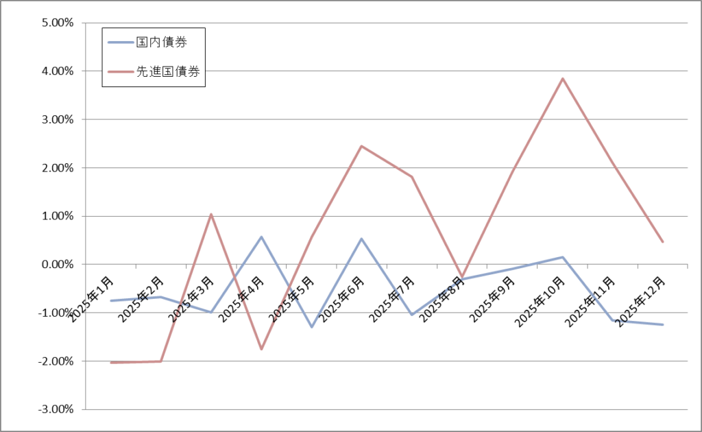 今月の一番成績が悪かったのは、国内債券の-1.25%でした。
