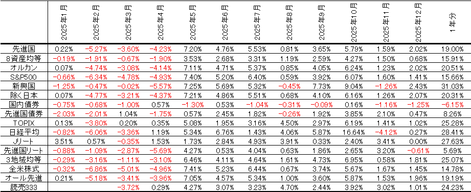 2位:日経平均、3位:Jリート、4位:TOPIX、6位:読売333となり好成績でした。