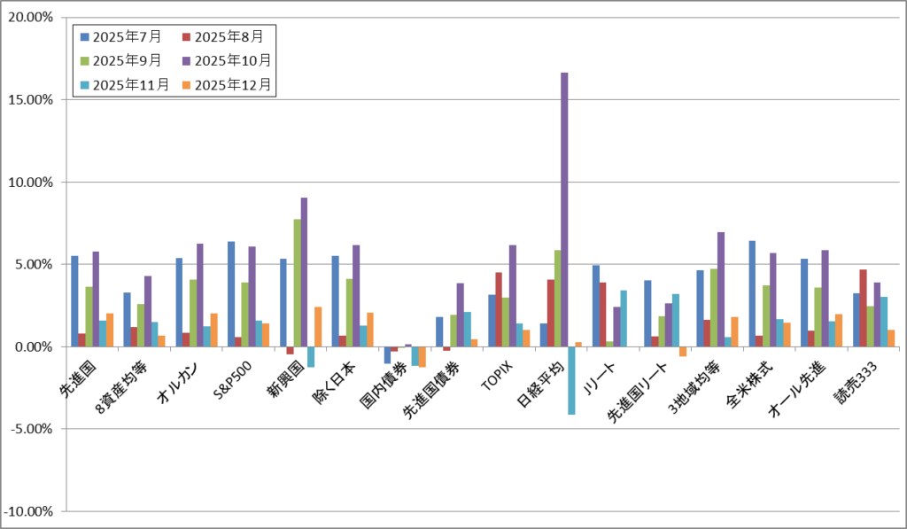 1月から4月はマイナス成長となるファンドが多く苦戦でしたが、5月以降は概ねプラス成長が多く、1年を通して国内債券を除いてプラス成長となりました。